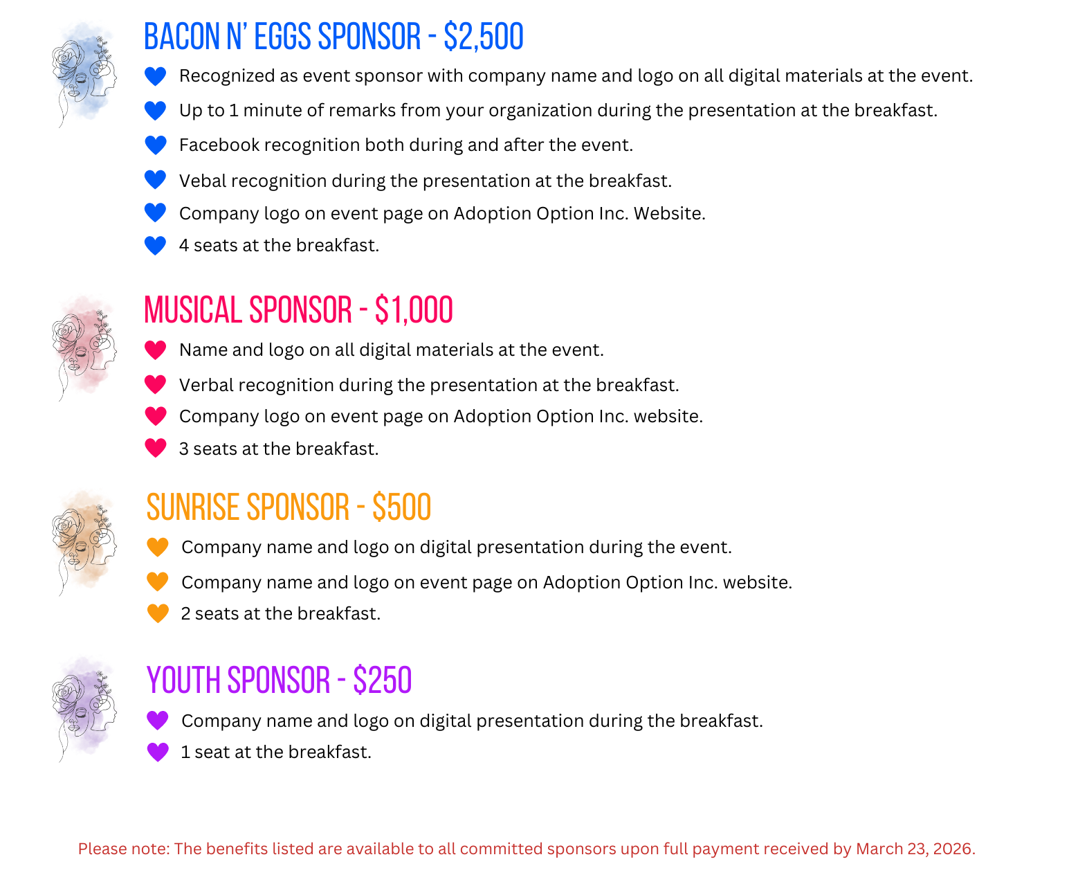 Join Adoption Option Inc. for an exclusive breakfast event, attended by some of the region’s most phenomenal leaders, philanthropists and child welfare advocates. This event will be held March 26, 2026 and will highlight the extraordinary accomplishments of the youth in the Youth in Transition Program and the transformative impact that mentors have made on the lives of youth in the community.